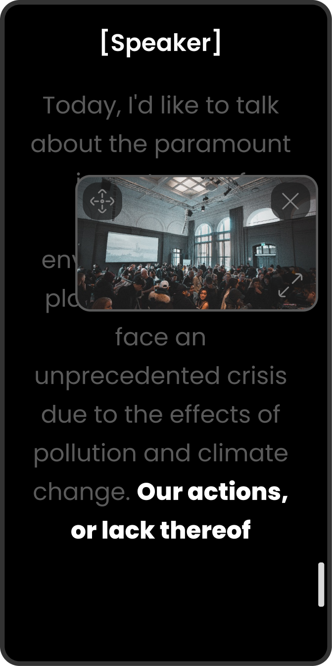 4all.live turns any microphone into real-time captions and translations on any screen: audience phones, stage displays, broadcast overlays, and post-event deliverables.